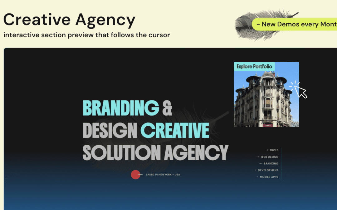 Creative Agency – Hero Section by risethemes | Nov 23, 2025 Creative Agency – Hero Section Was Now $49 Sale Unlimited DownloadsUnlimited ActivationsNo Premium plugins requiredBuild with Divi Builder 5 Pricing Lifetime Membership $49 Yearly Membership $10 / yr Quantity Enter an amount $ Add to Cart Add to Cart You may also like Previous Next Sale Kanew Portfolio for Divi 5 $79 Sale Rise Blog Kit Collection $79 Sale Rise Designer Layout Collection $79